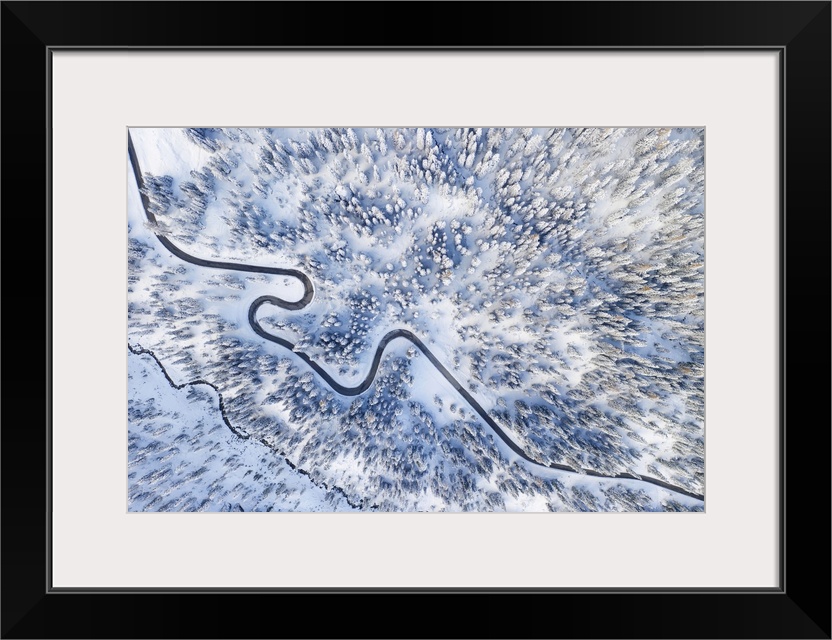 <p>the black snake that leads to Giau Pass, surrounded by trees and snow-covered meadows, Unesco World Heritage Site, Belluno province, Veneto district, Italy, Europe</p>