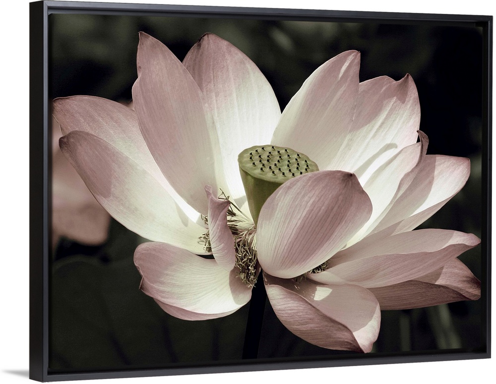 <p>Close-up photograph of a lotus flower with muted pink, green, and white hues.</p>