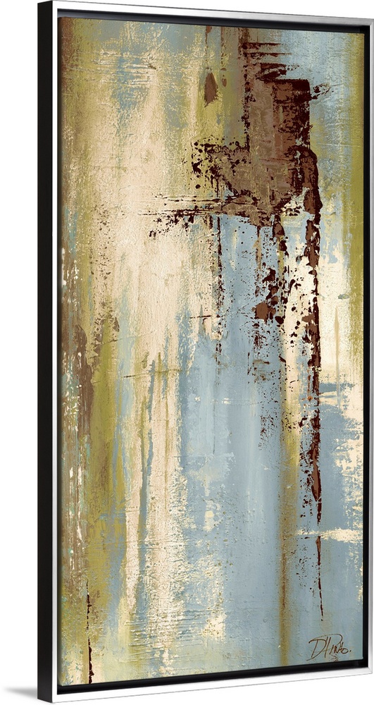 <p>Contemporary abstract painting using blue tones mixed with gray and brown in vertical streaking motions.</p>