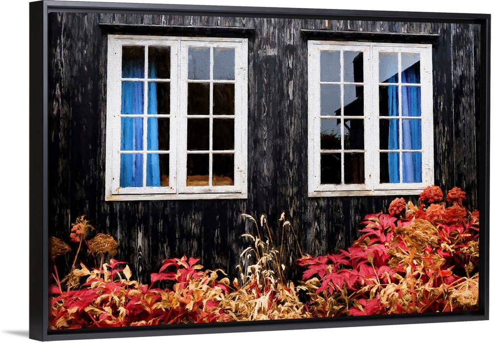 <p>Two windows with white frames and blue curtains in a black wall over orange bushes.</p>
