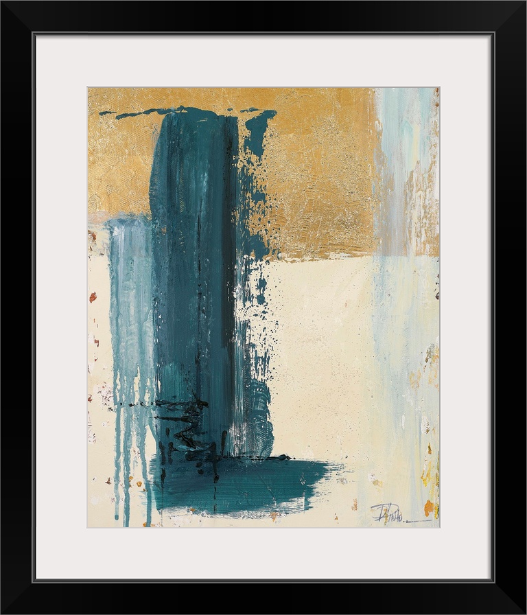 <p>An abstract painting with a bold, blue brush stroke moving vertically down and stopped by a small horizontal brushstroke, moving your eye to the right side. This sits on a gold and cream colored background with hints of yellow and blue popping out.</p>