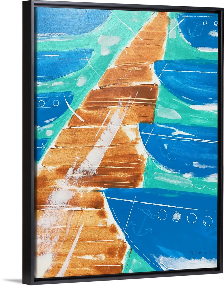 <p>Painting of an abstract boat dock with boats in the boat slips.</p>