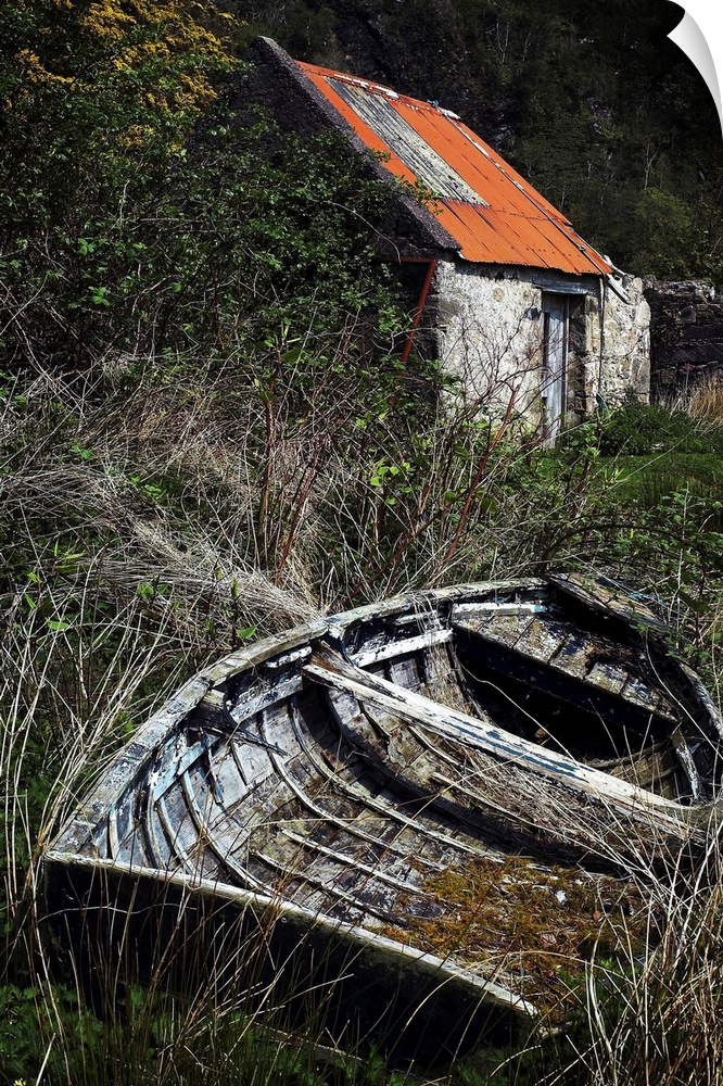 <p>An old rowing boat in long grass near an outbuilding with a tin roof</p>