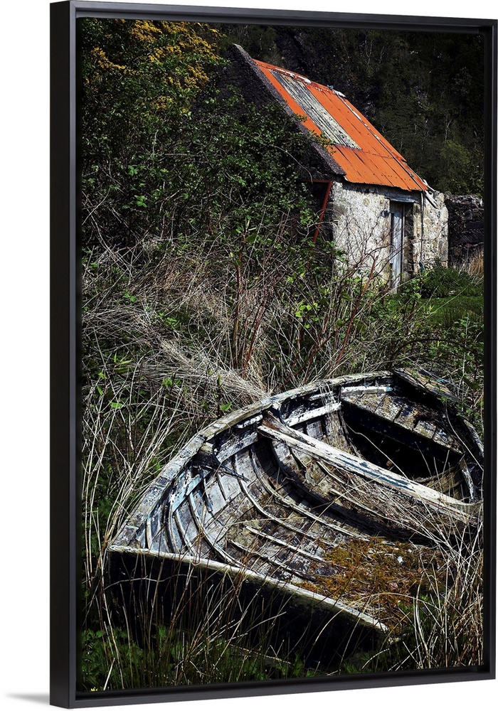 <p>An old rowing boat in long grass near an outbuilding with a tin roof</p>