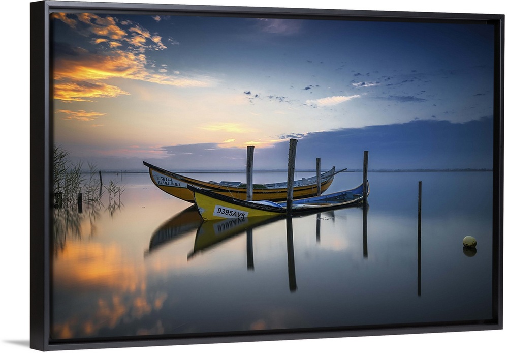 <p>Photograph of two yellow boats docked on a calm lake at sunset.</p>