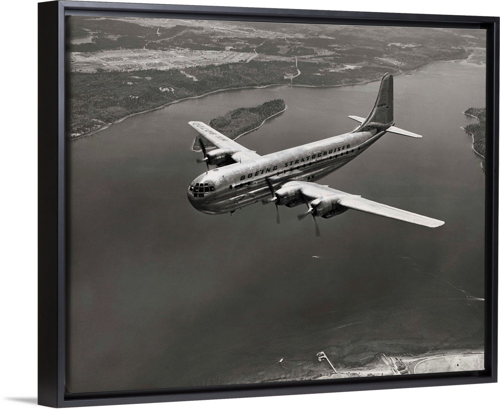 <p>Luxurious Stratocruiser Shown on Test Flight. The calm waters of Puget Sound near Seattle form the backdrop for this photograph of the graceful Boeing Stratocruiser. The new Boeing, largest, fastest, and most luxurious of all postwar airliners, will join the fleets of Pan American World Airways, Scandinavian Airlines System, Northwest Airlines, American Overseas Airlines, United Air Lines and the British Overseas Airways Corporation. The 67 1/2 ton, 80 passenger Stratocruiser is a double-deck airliner developed from the famed Boeing B-29 Superfortress and the AAF's Boeing C-97 troop and cargo transport. It is 110 feet, 4 inches long, has a wingspan of 141 feet and 3 inches, and the tip of its tail reaches a height of 38 feet, 3 inches from the ground.</p>