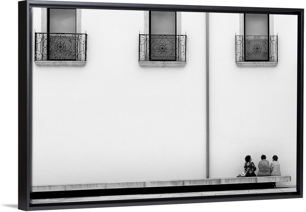 <p>Three people seated on a bench under three windows with iron railings.</p>