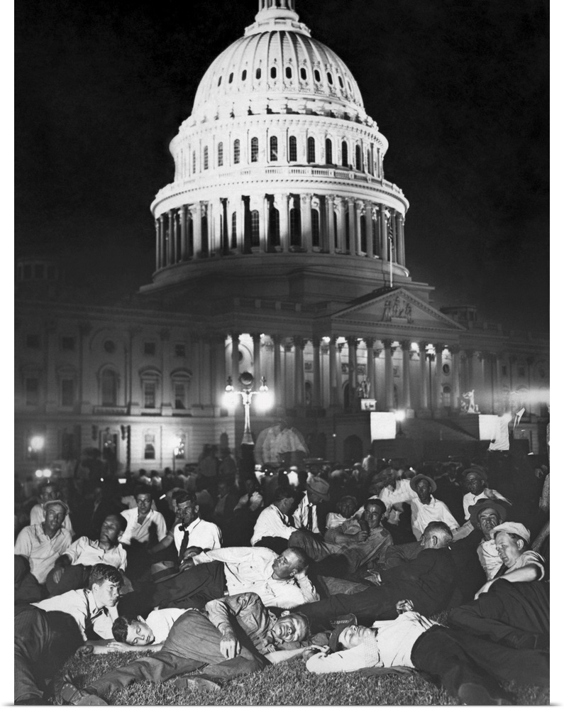 <p>The Bonus Army, veterans of American military services from World War One owed bonus money, camped out on the lawn of the United States Capitol on July 13, 1932.</p>