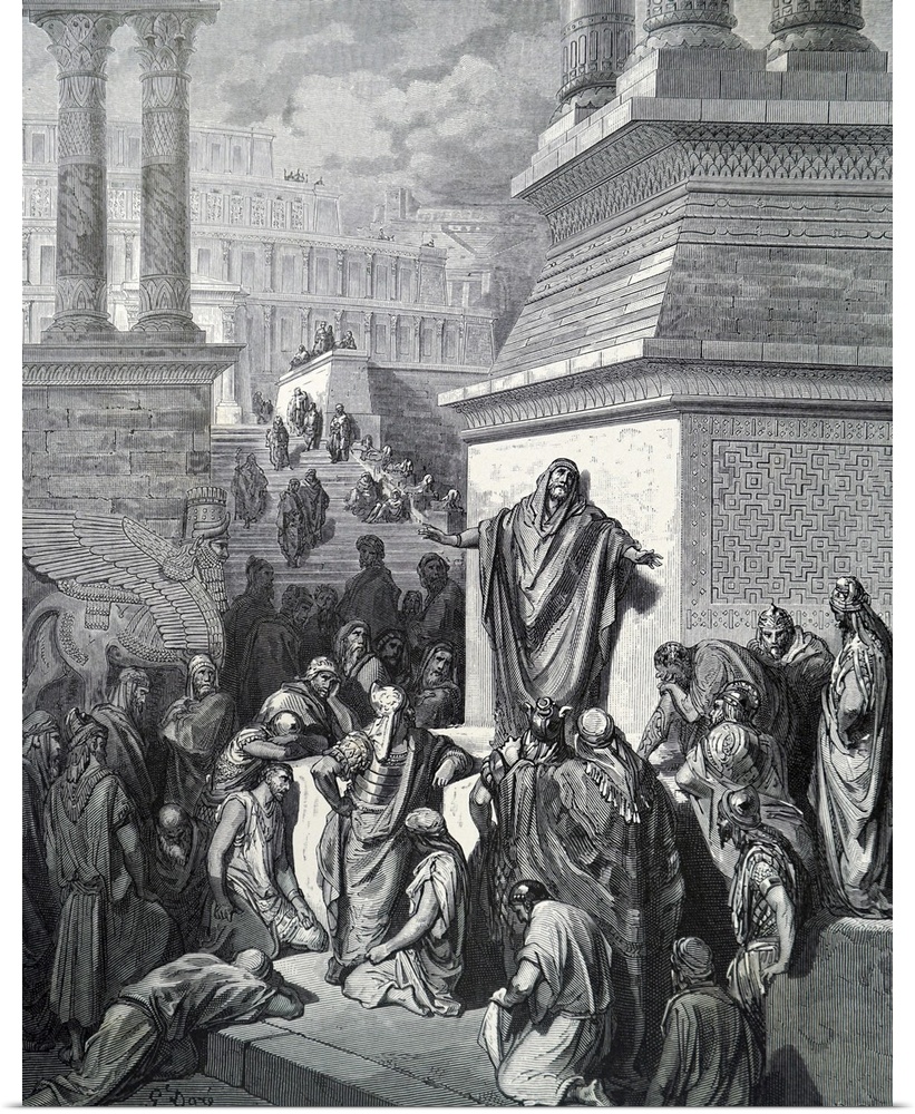 <p>Engraving depicting a scene from The Book of Jonah. The Book of Jonah depicts Nineveh as a wicked city worthy of destruction. God sent Jonah to preach to the Ninevites of their coming destruction, and they fasted and repented because of this. Dated 19th c.</p>