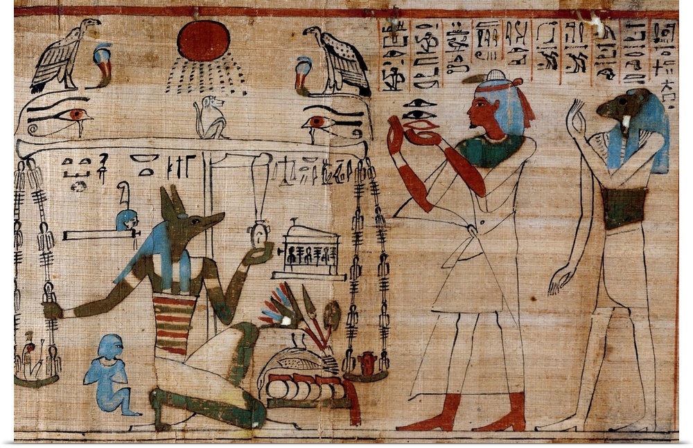 <p>Egyptian civilization: the weighing of the soul. Detail of Book of Dead depicting Anubis weighing the heart of the deceased against the Feather of Truth, papyrus preserved at the Egyptian Museum of Torino, Italy</p>