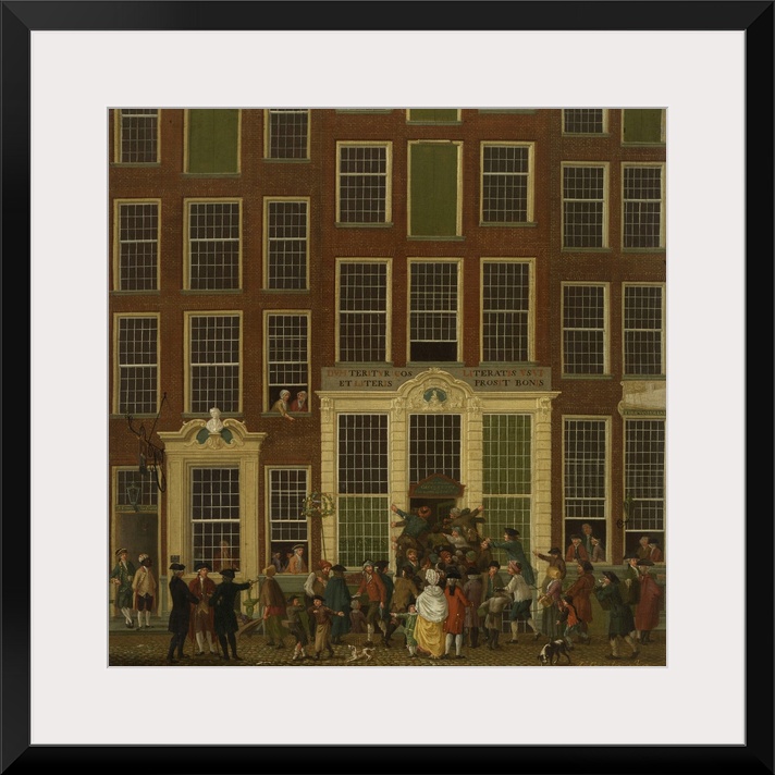 <p>The Bookshop and Lottery Agency of Jan de Groot in the Kalverstraat in Amsterdam, by Isaac Ouwater, 1779, Dutch painting, oil on canvas. Men push and shove to enter the door of the lottery agency for lottery ticket sales established by the States General</p>