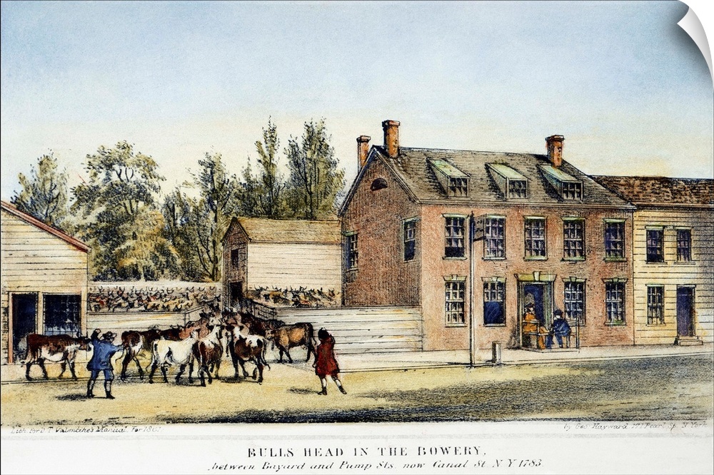 <p>The Bull's Head Tavern in the Bowery, New York, as it appeared in 1783. Lithograph, 1861.</p>