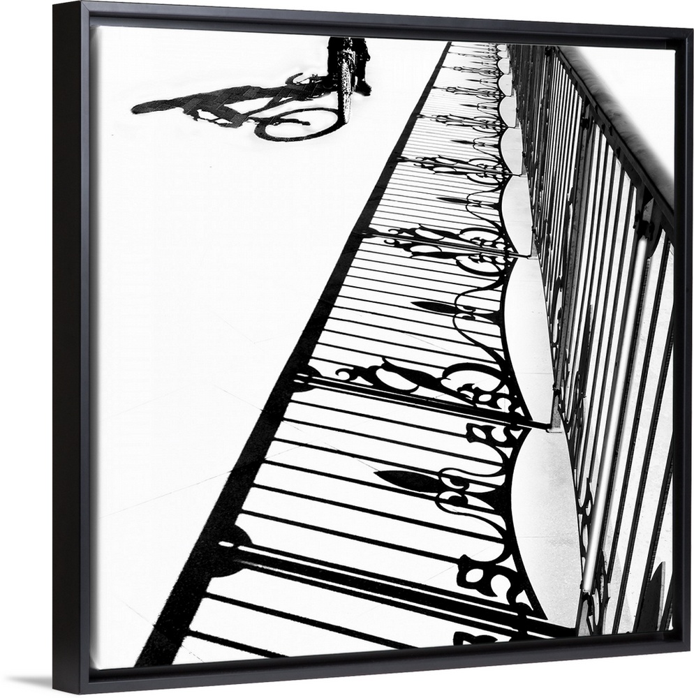 <p>Black and white photograph of a bicycle and fence shadow onto the ground on a bright day.</p>