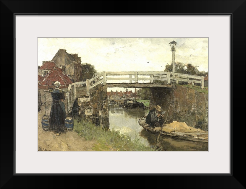 <p>The Bridge, by Jacob Maris, c. 1879, Dutch painting, oil on canvas. Peasant Woman carries two pails of milk with a yoke, while a man in small sand barge lights his pipe. Scene near The Hague was begun as a plein air sketch and then worked up in the studio.</p>