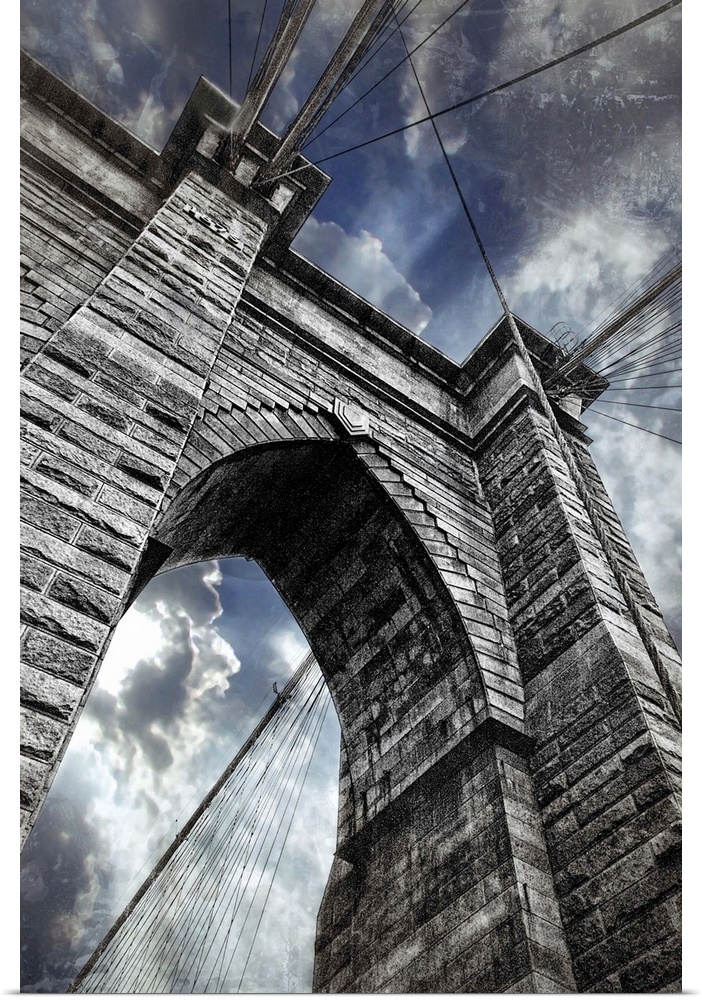 <p>This large vertical piece is a photograph taken on the Brooklyn bridge and looking up toward the top of it.</p>