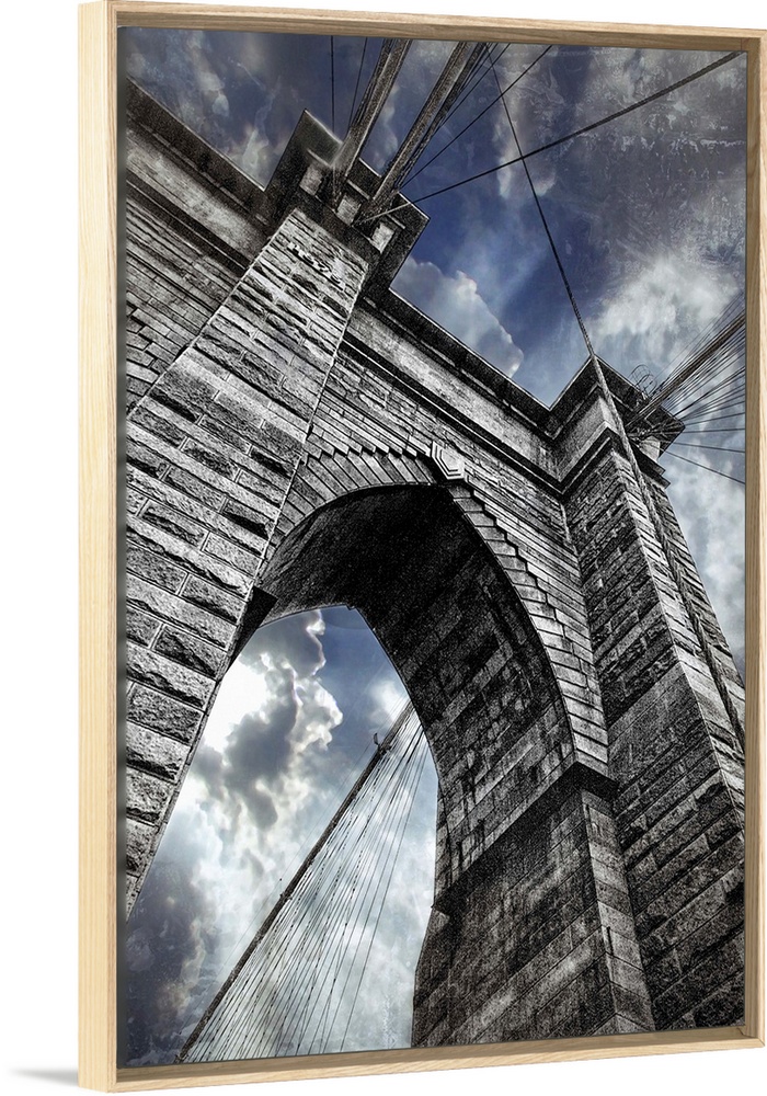 <p>This large vertical piece is a photograph taken on the Brooklyn bridge and looking up toward the top of it.</p>