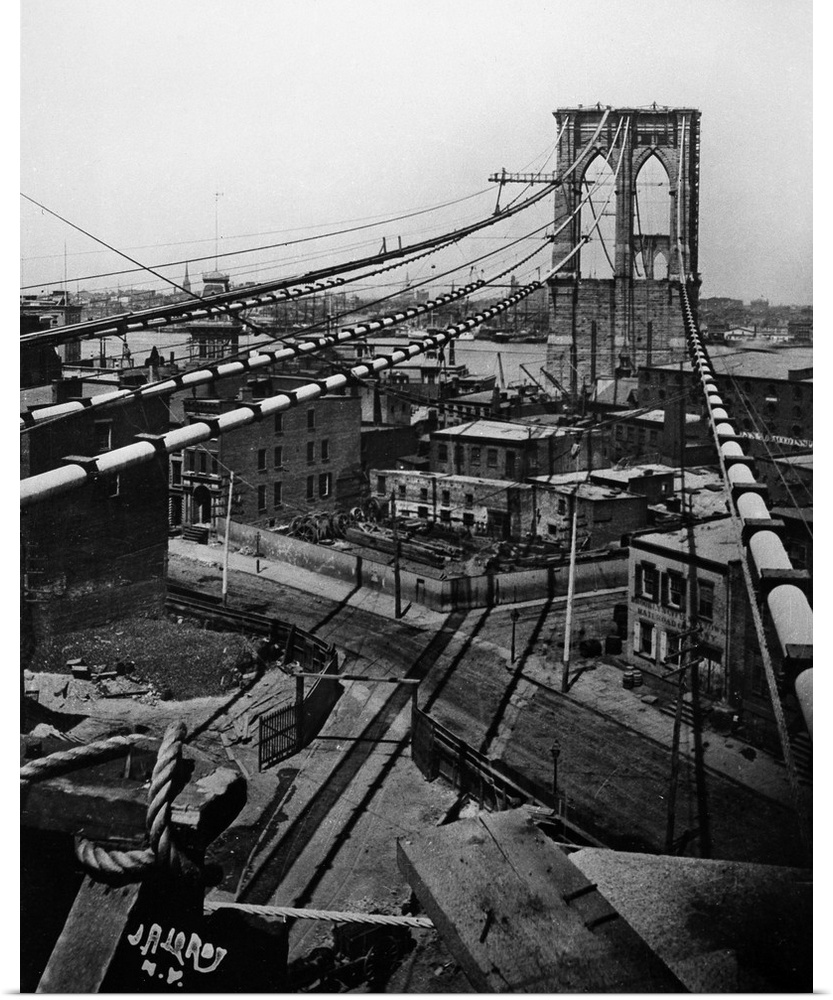 <p>The Brooklyn Bridge under construction over the East River in New York City, c1880.</p>