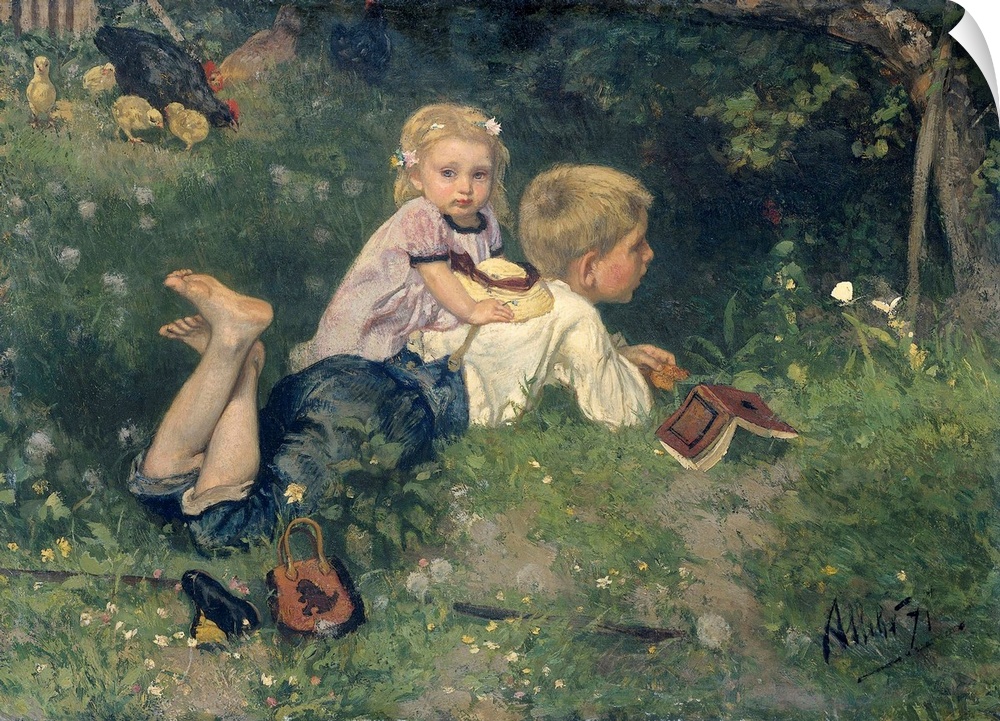 <p>The Butterflies, by August Allebe, 1871, Dutch painting, oil on panel. A boy lying on grass while watching butterflies. He is accompanied by a blond little girl. A black hen with her chicks is nearby.</p>