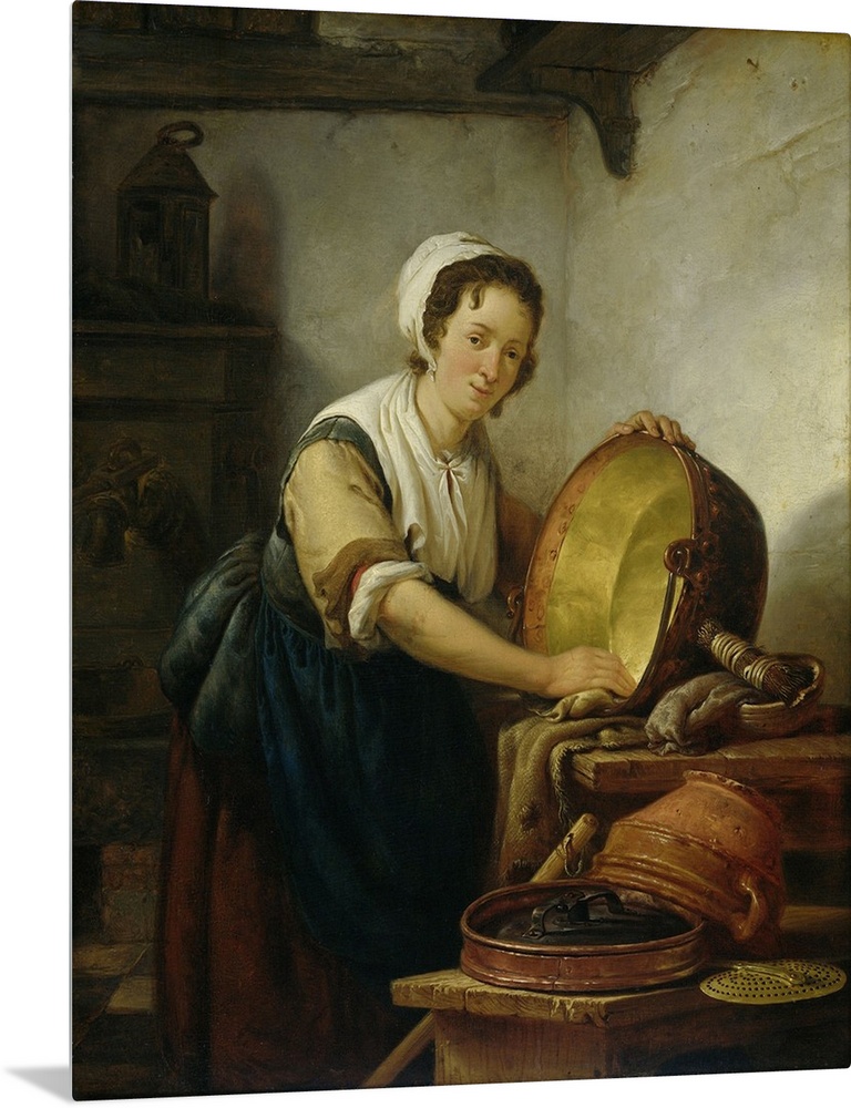 <p>The Caldron Scrubber, by Abraham van Strij 1st, c. 1808-10. Dutch painting, oil on panel. Women in a kitchen cleaning a large copper pot by sanding. In foreground are an earthenware jar and lid.</p>