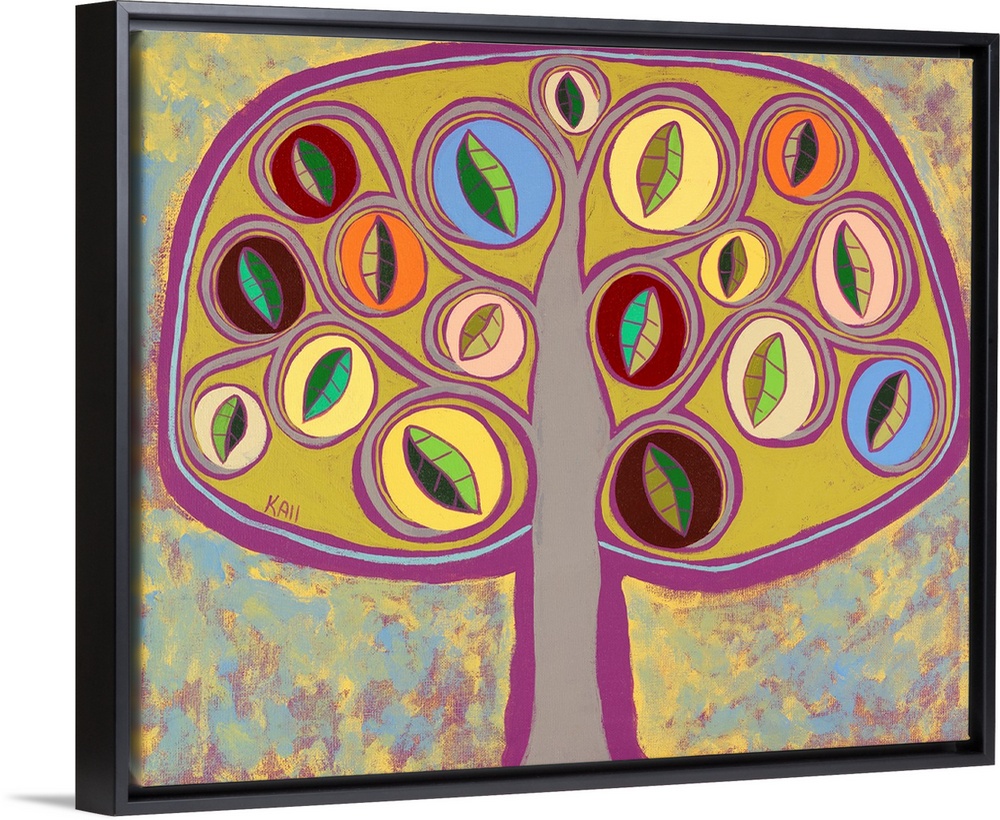 <p>Contemporary painting of a tree with curled branches and round leaves.</p>
