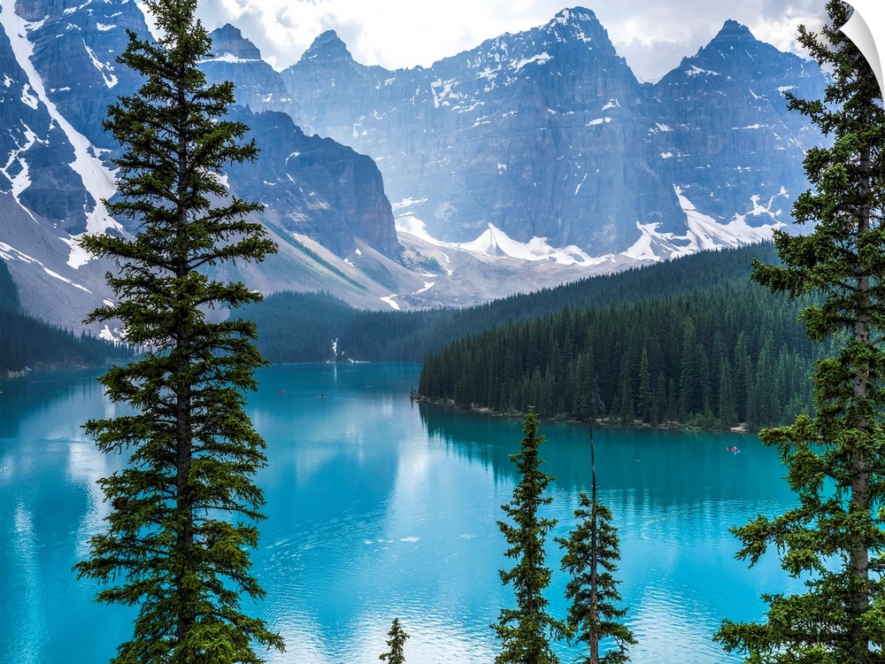 <p>Stunning view of the rugged Canadian rocky mountain peaks and a tranquil turquoise Moraine Lake with forests along the shoreline; Field, British Columbia, Canada</p>