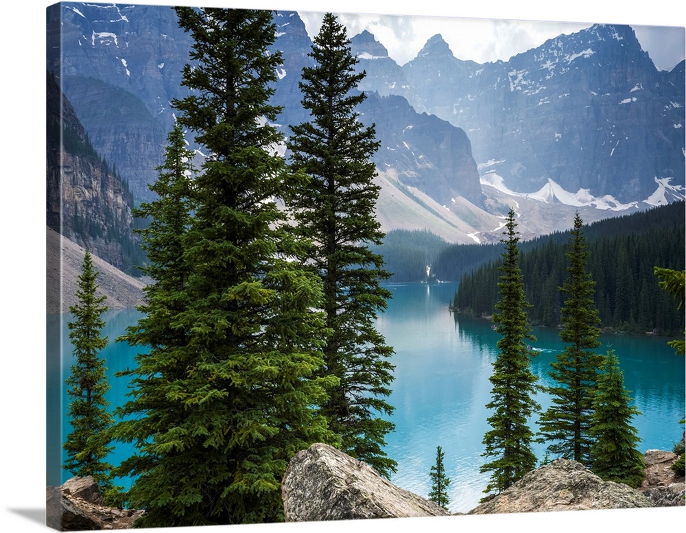 <p>Stunning view of the rugged Canadian rocky mountain peaks and a tranquil turquoise Moraine Lake with forests along the shoreline; Field, British Columbia, Canada</p>