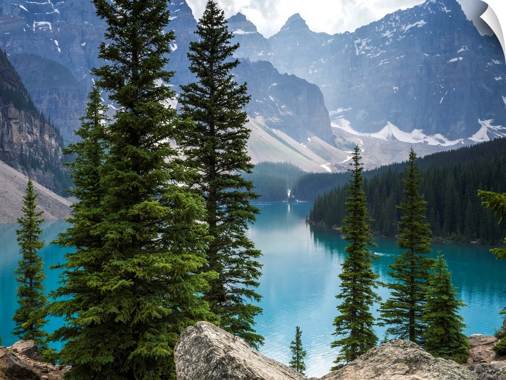 <p>Stunning view of the rugged Canadian rocky mountain peaks and a tranquil turquoise Moraine Lake with forests along the shoreline; Field, British Columbia, Canada</p>