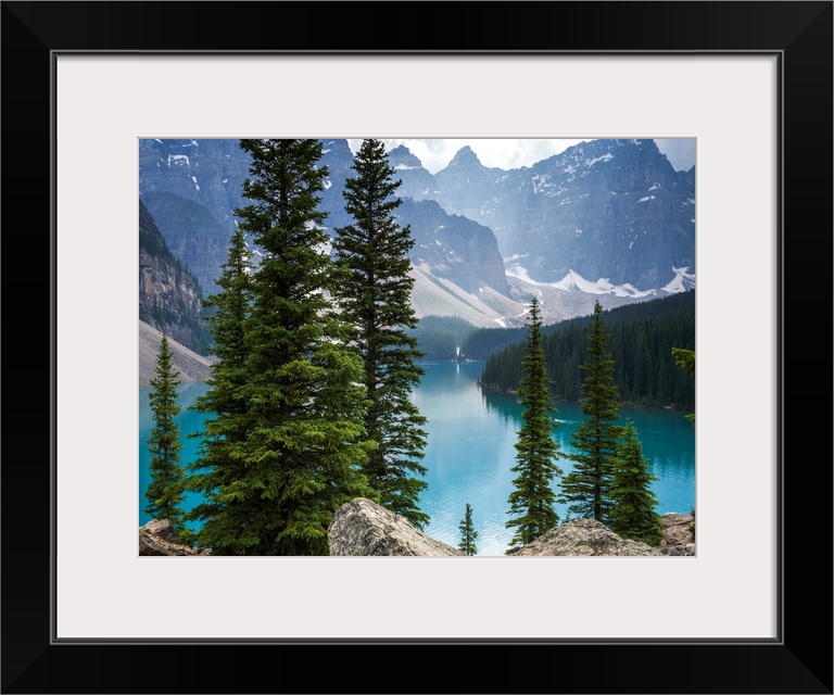 <p>Stunning view of the rugged Canadian rocky mountain peaks and a tranquil turquoise Moraine Lake with forests along the shoreline; Field, British Columbia, Canada</p>