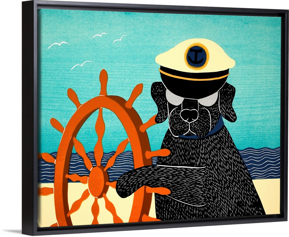 <p>Illustration of a black lab wearing a sailors hat and pawing a ship wheel on the beach.</p>