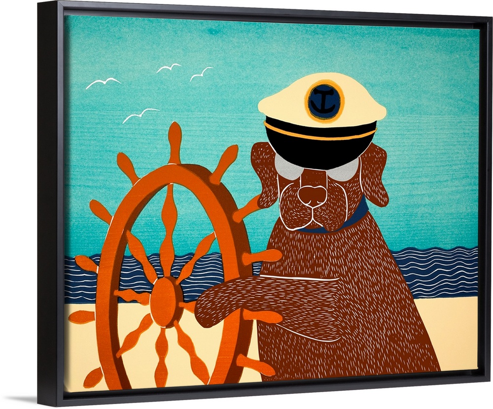 <p>Illustration of a chocolate lab wearing a sailors hat and pawing a ship wheel on the beach.</p>