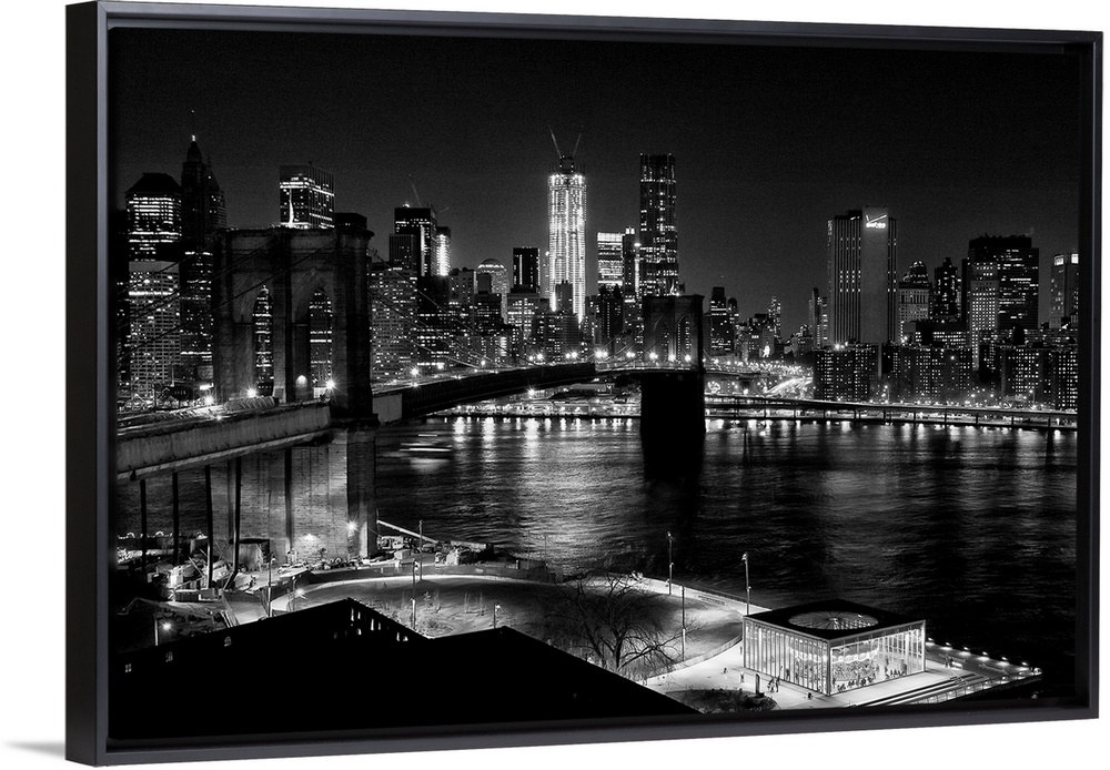 <p>Black and white photograph of a city skyline at night. With abridge spanning over bay.</p>
