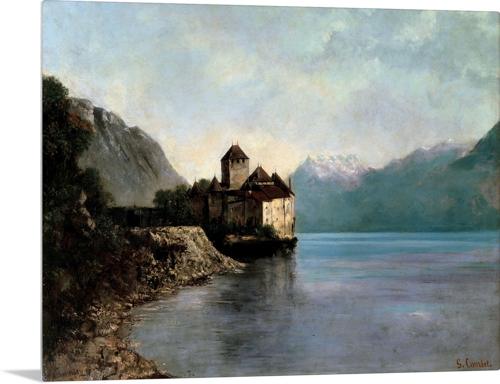 <p>The Castle of Chillon. Evening. A castle by the lake Leman in Switzerland. Painting by Gustave Courbet (1819-1877), 19th century. Ornans, birthplace House of Gustave Courbet, Doubs, France</p>