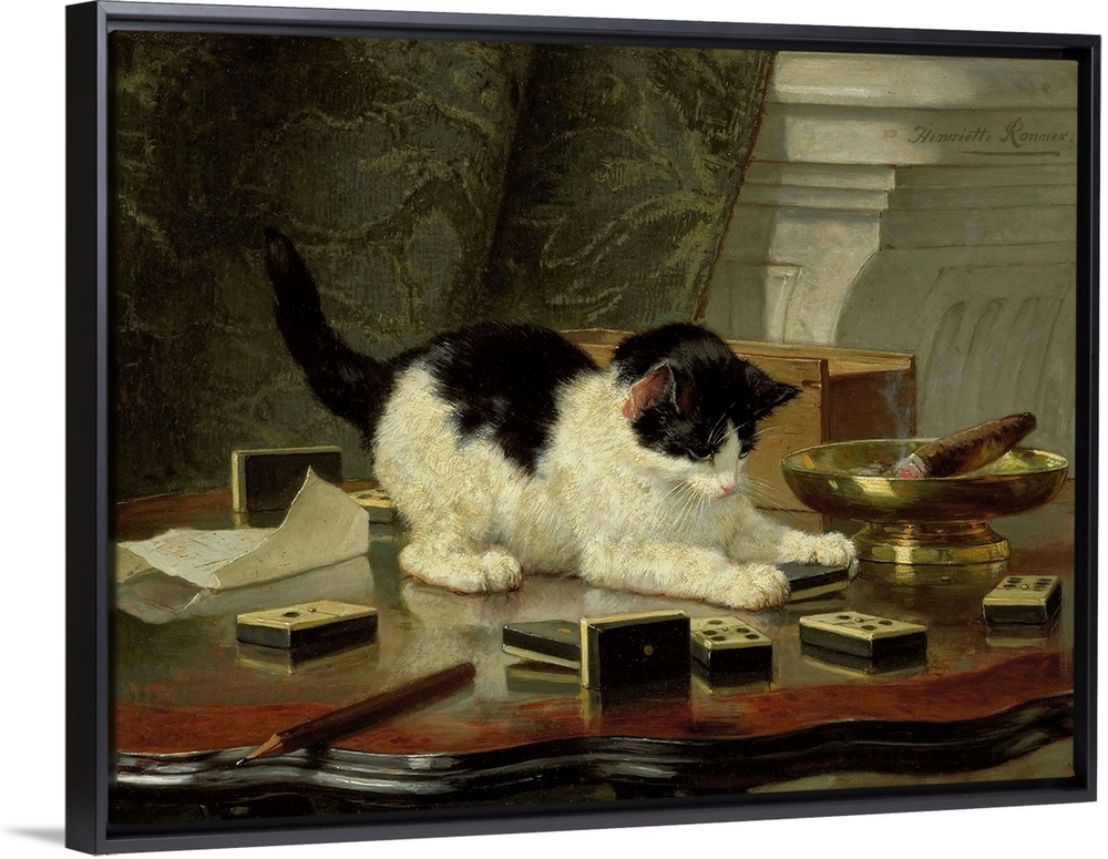 <p>The Cat at Play, by Henriette Ronner, c. 1860-78, Belgian-Dutch painting on panel. Black and white cat on a table with a dominoes in its paws.</p>
