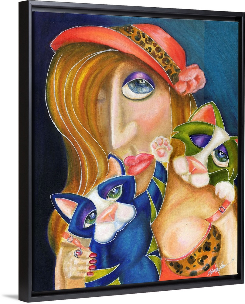 <p>Contemporary artwork in the style of cubism of a woman with two cats in bold colors.</p>