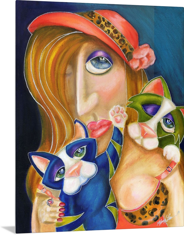 <p>Contemporary artwork in the style of cubism of a woman with two cats in bold colors.</p>