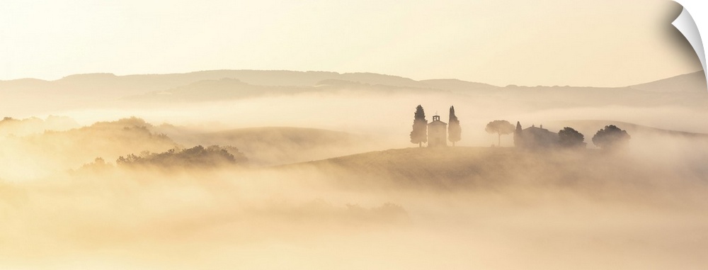 <p>The Chapel of Madonna di Vitaleta shrouded in mist at dawn. Val d'Orcia, near San Quirico d'Orcia, Tuscany, Italy.</p>