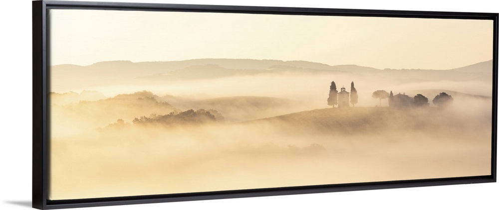<p>The Chapel of Madonna di Vitaleta shrouded in mist at dawn. Val d'Orcia, near San Quirico d'Orcia, Tuscany, Italy.</p>