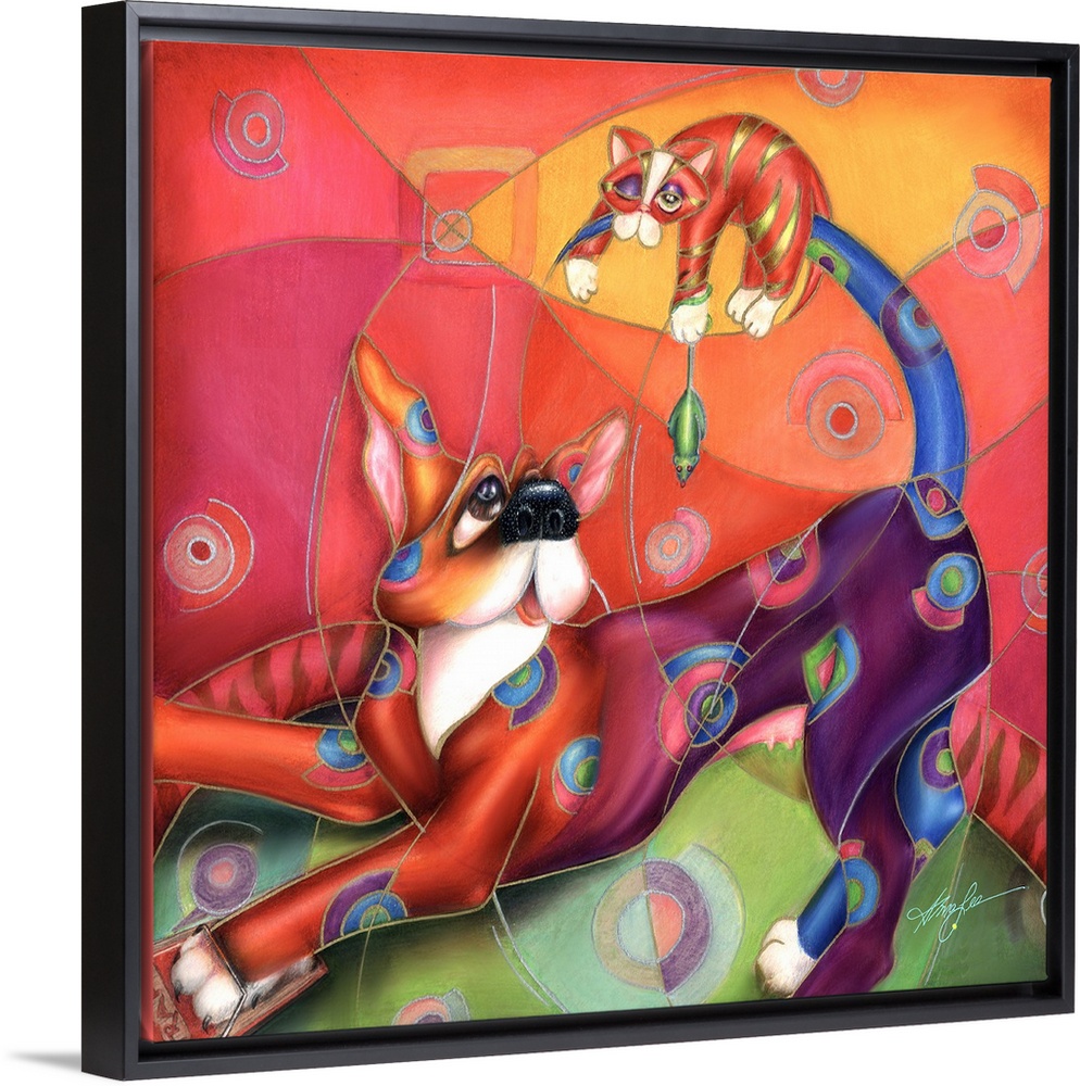 <p>Contemporary artwork in the style of cubism of a dog with a cat on his tail in bold colors.</p>