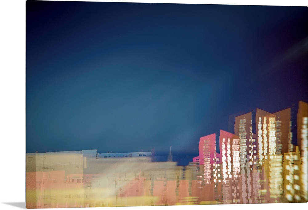 <p>Long exposure photograph of a city skyline with movement and distortion.</p>