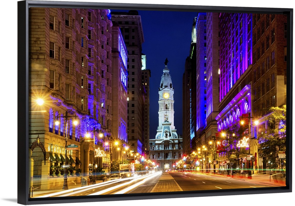 <p>Fine art photograph of City Hall in Philadelphia in the evening, with light trails in the street.</p>