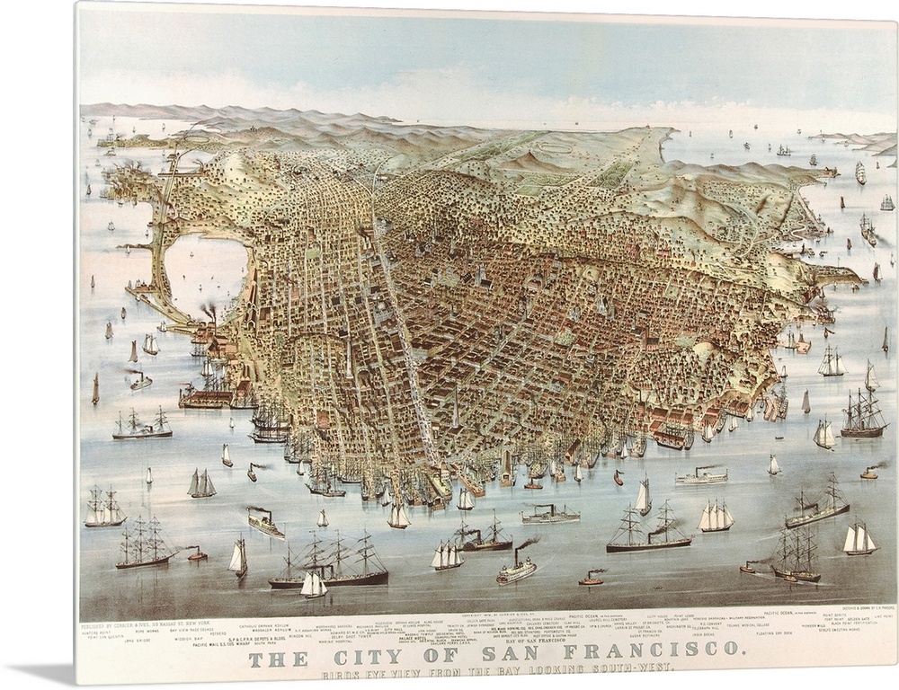 <p>The City of San Francisco - Bird's Eye view from the Bay, looking southwest, 1878 (originally colour lithograph) by Currier, N. (1813-88) and Ives, J.M. (1824-95)</p>