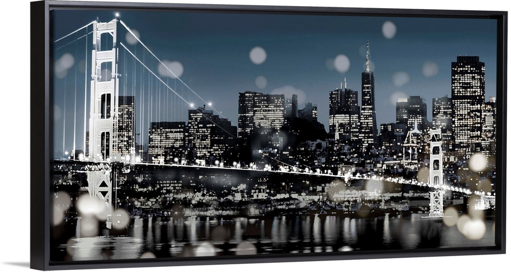 <p>San Francisco skyline at night with a blue sky, the Golden Gate Bridge, and bokeh lights in the foreground.</p>