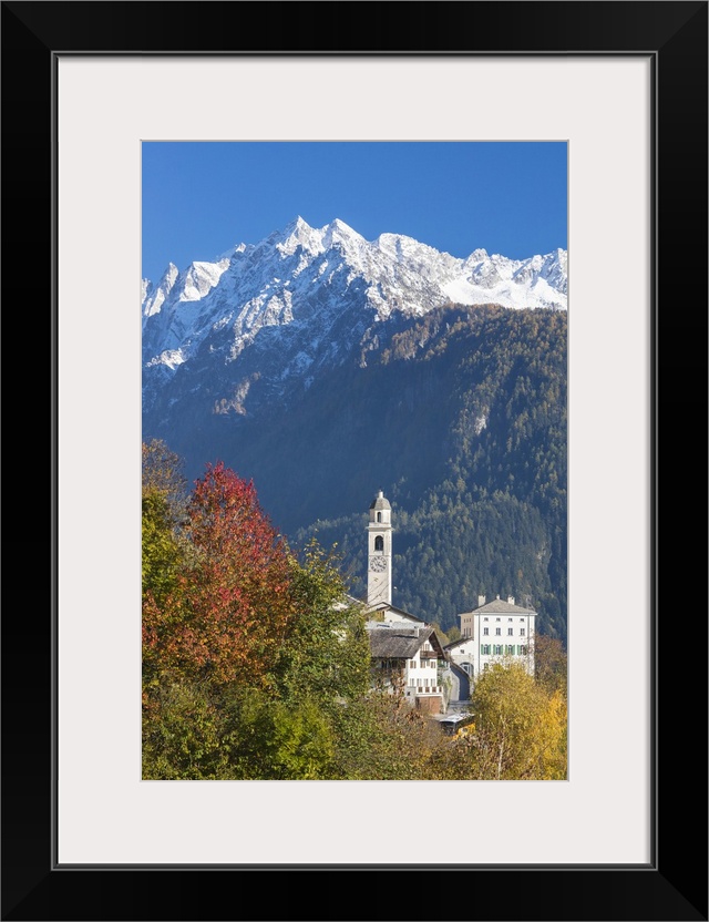 <p>The colorful trees frame the alpine church and the snowy peaks, Soglio, Bregaglia Valley, Canton of Graubunden, Swiss Alps, Switzerland</p>