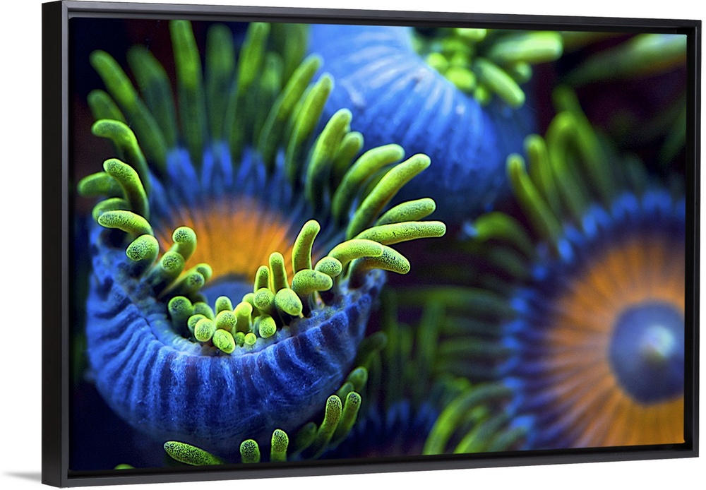 <p>Neon colored sea anemones with numerous tentacles in an aquarium.</p>