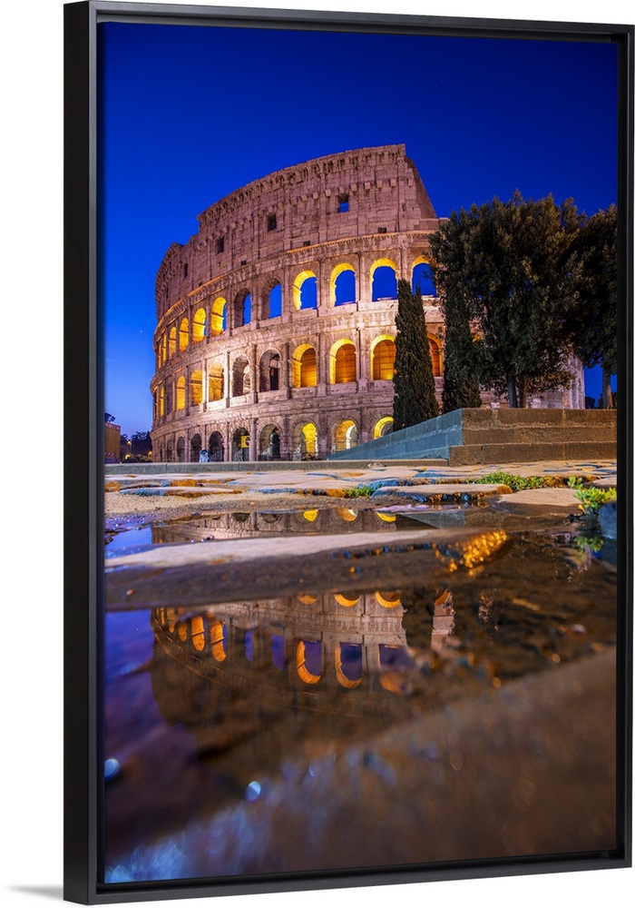 <p>Photograph of the Colosseum at night reflecting into a puddle on the ground.</p>