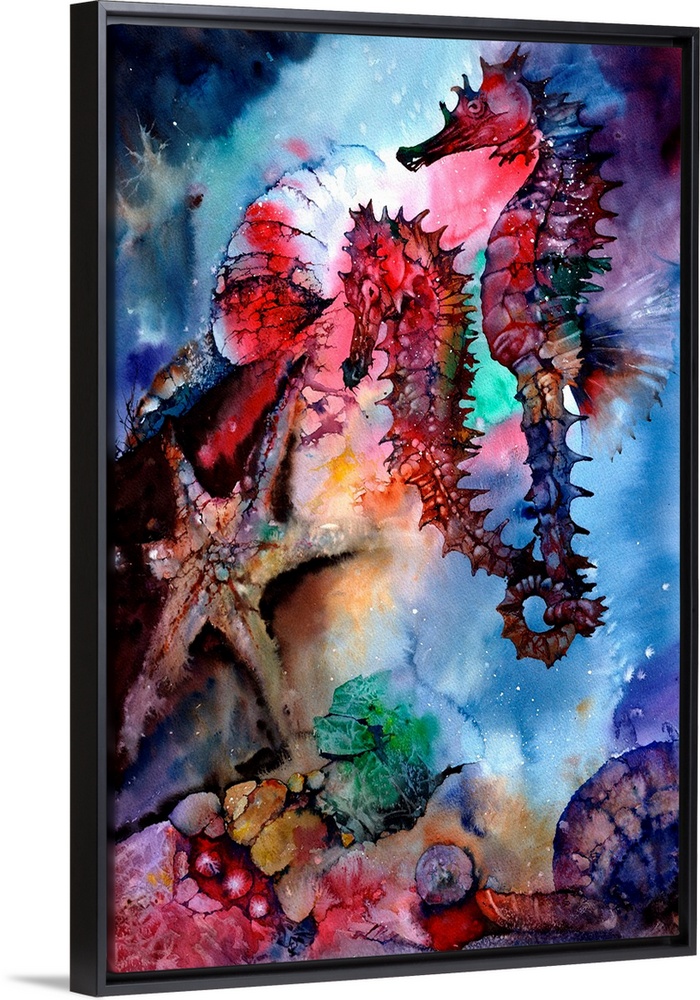 <p>A colorful, impressionistic watercolor depicting sea horses and other sea creatures. Loosely painted with intense colors.</p>