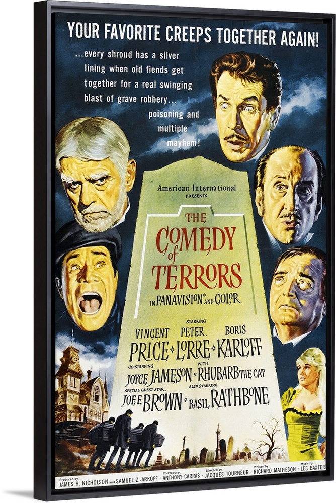 <p>THE COMEDY OF TERRORS, clockwise from mid-left: Joe E. Brown, Boris Karloff, Vincent Price, Basil Rathbone, Peter Lorre, Joyce Jameson on 1-sheet poster painted by Reynold Brown, 1964.</p>