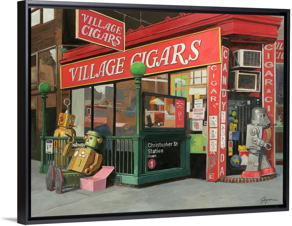 <p>A contemporary painting of a city scene of retro toy robots walking in and around a cigar shop smoking cigars and eating donuts.</p>