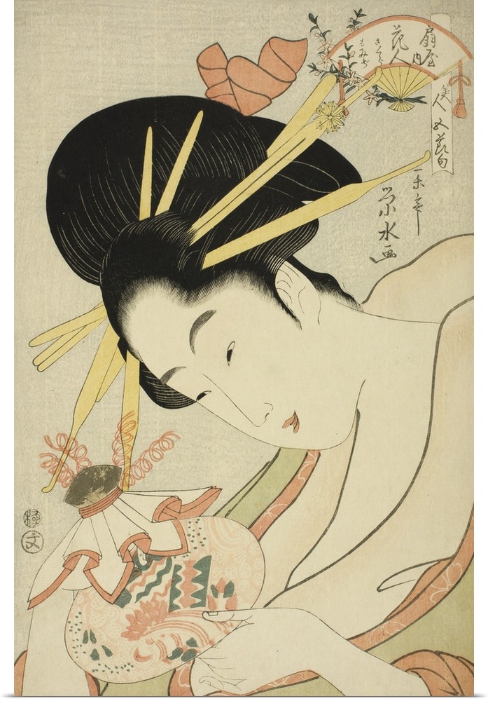 <p>The Courtesan Hanahito of the Ogiya and attendants Sakura and Momiji, from the series Beauties of the Five Festivals, Bijin gosekku, c.1795-1800, colour woodblock print.</p>
