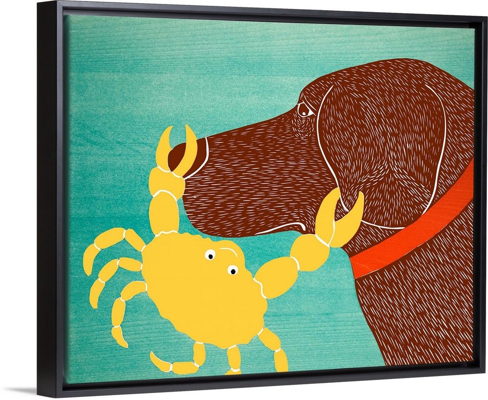 <p>Illustration of a chocolate lab with a yellow crab pinching its nose and ear.</p>